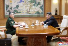 El camarada líder Kim Jong Un recibe a una delegación militar de la Federación...