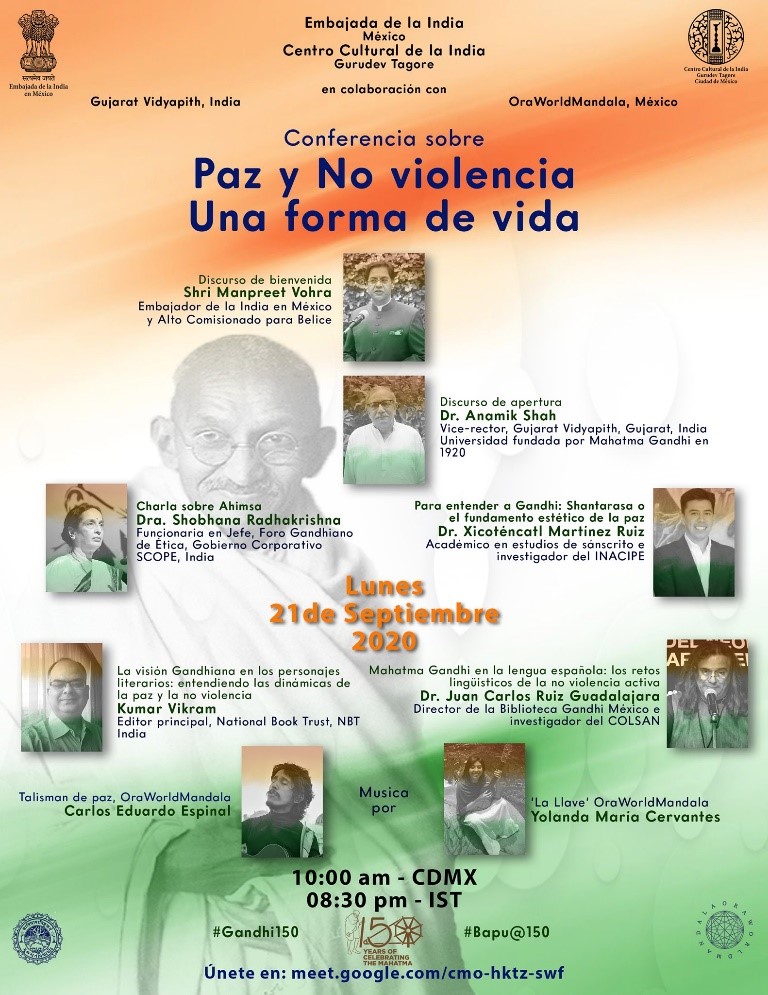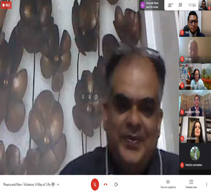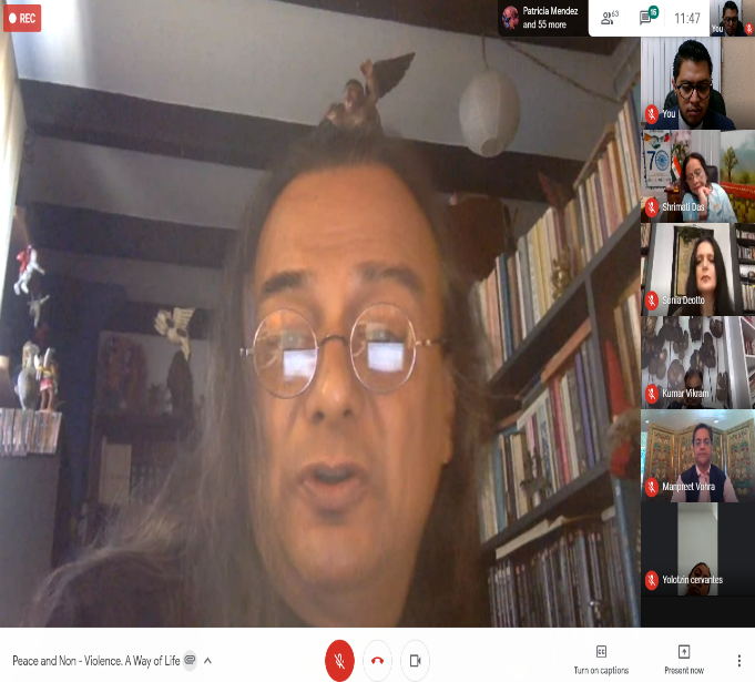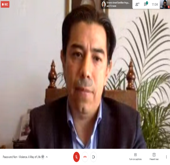 El discurso de bienvenida fue proclamado por Su Excelencia, el Embajador de la India en México, Shri Manpreet Vohra, quien mencionó que los desafíos ante nosotros son transformar la violencia en acciones no violentas encaminadas a despertar un diálogo en la sociedad sobre cuestiones fundamentales y éticas. El futuro de la humanidad depende de su adopción de la no violencia como principio de la vida. La creciente preocupación de la comunidad internacional se ha reflejado en las declaraciones y decisiones de organizaciones internacionales, incluidas la Organización de las Naciones Unidas. La ONU, en su 61 Asamblea General, declaró el 2 de octubre como «El Día Internacional de la No Violencia».