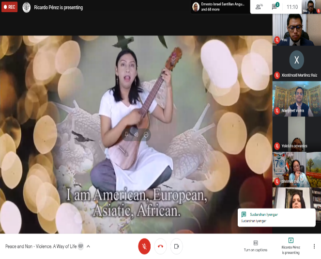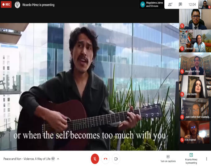 El evento también contó con la presentación de cuatro videos musicales sobre la influencia de Gandhi, el primero ‘La Llave’ por Yolanda María Cervantes Ríos de OraWorldMandala, seguido por «De di Hume Azaad Bina, Khadaga Bina Dhaal» por Piyali Das y “Talismán de Paz” de OraWorldMandala por el artista gandhiano Carlos Eduardo Espinal.