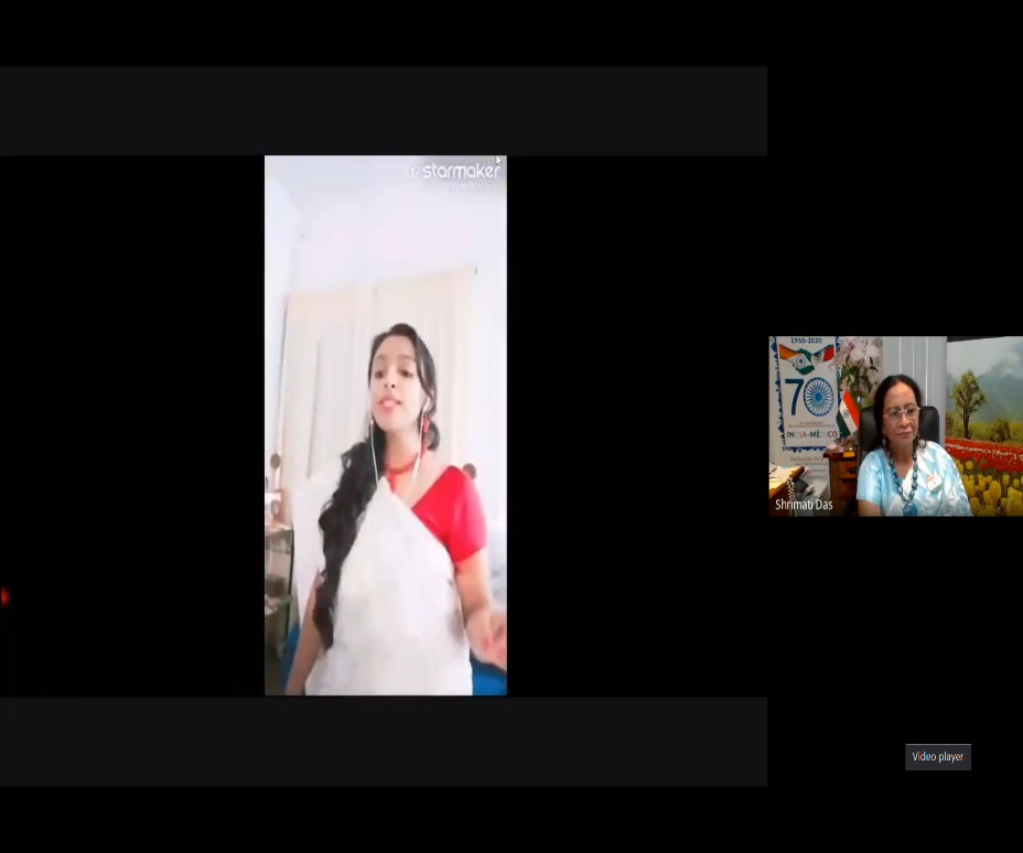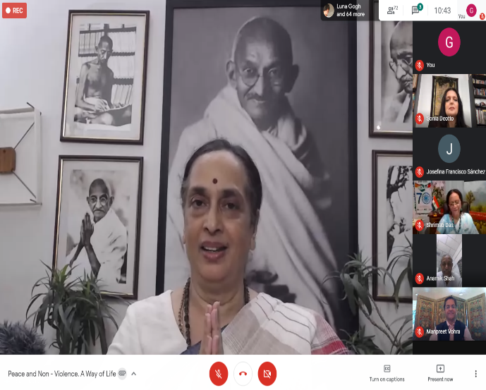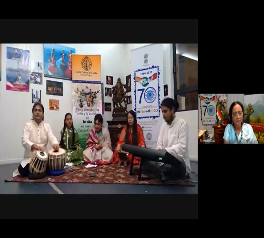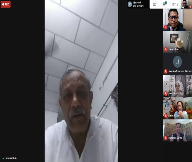 La videoconferencia comenzó con un Bhajan titulado «Vaishnava Jana to Tene Kahiye Je Peedh parayee Jane re» cantado por el maestro de música y estudiantes del GTICC .