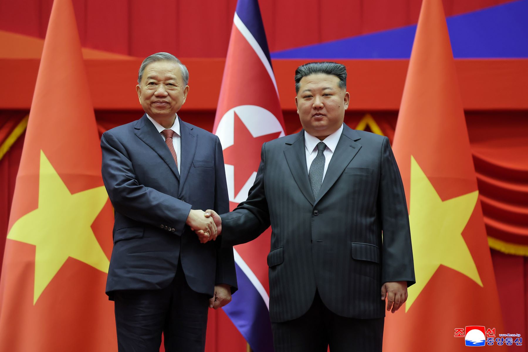 El camarada Kim Jong Un se reunió con agrado con To Lam y se fotografió junto a él ante las banderas nacionales de ambos países.