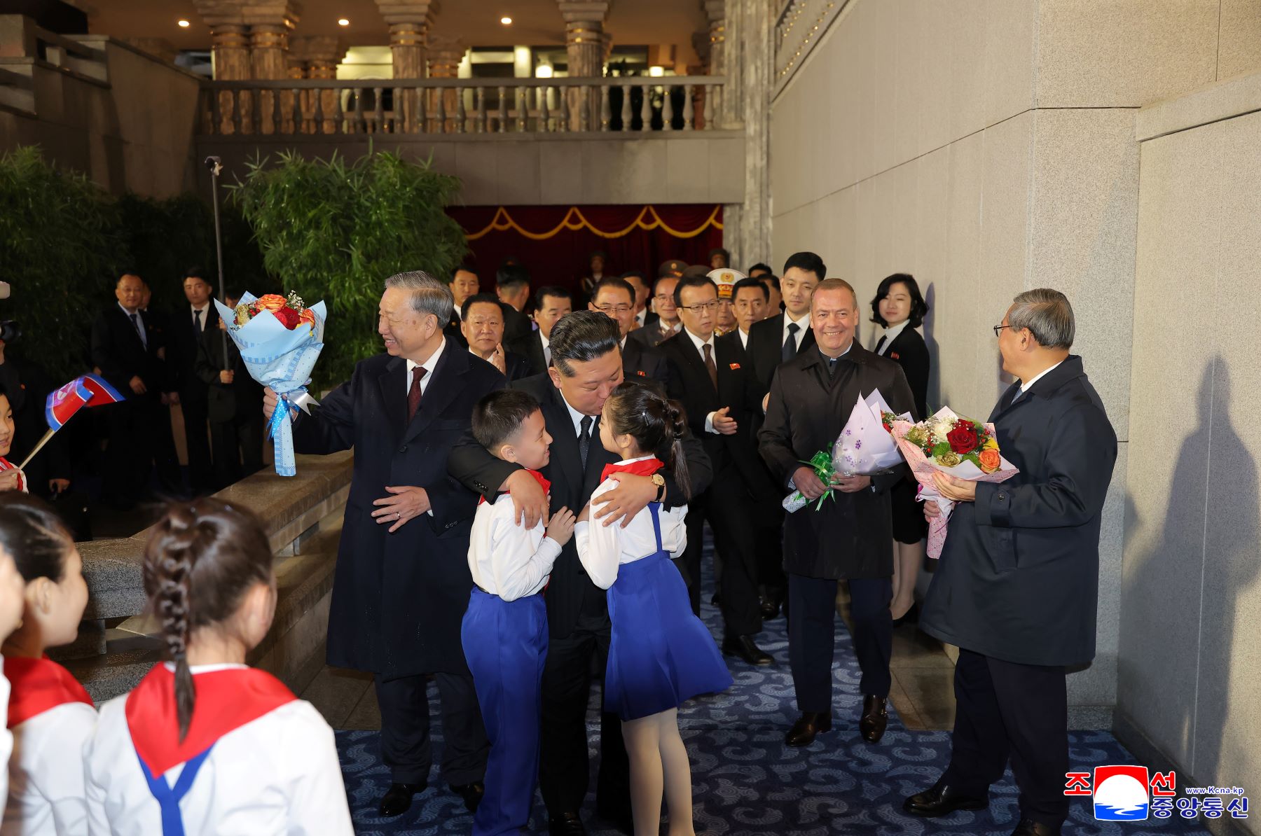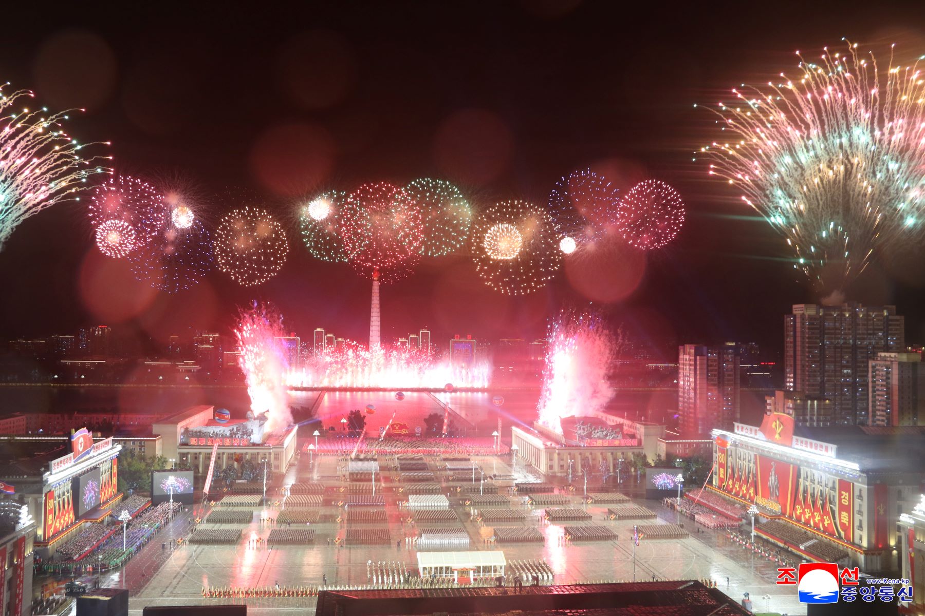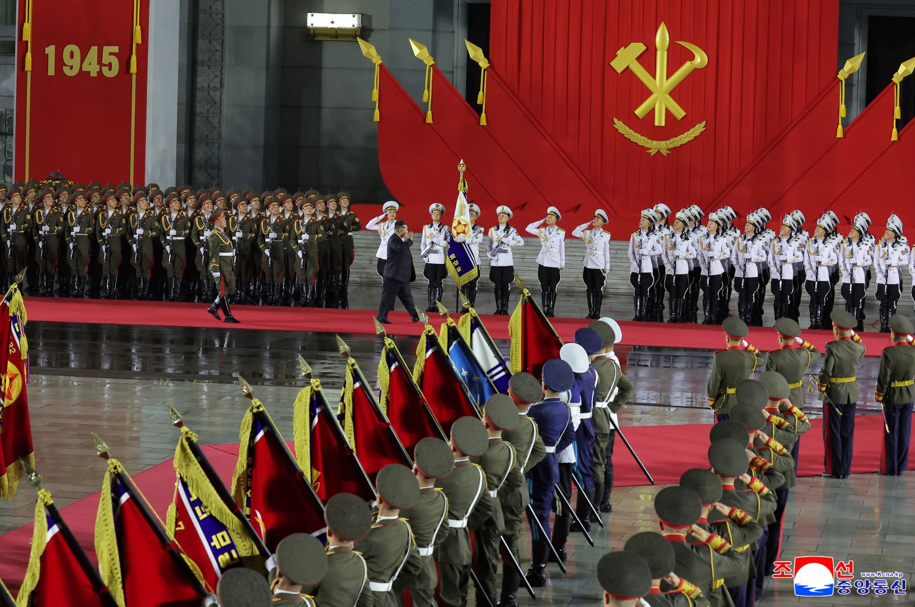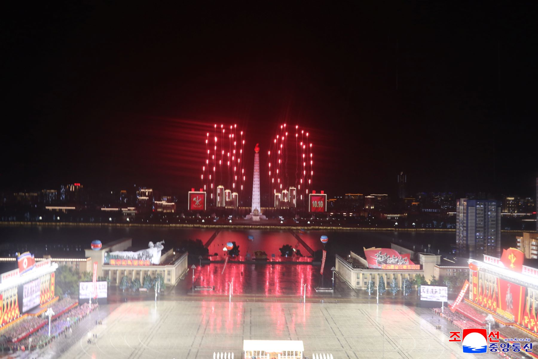 En medio de la interpretación de la música de bienvenida, el camarada Kim Jong Un salió a la tribuna junto con los jefes de partido y gobierno de varios países. Estallaron las estruendosas aclamaciones «¡Viva!» y se lanzaron los fuegos artificiales en el cielo nocturno de la fiesta de octubre.