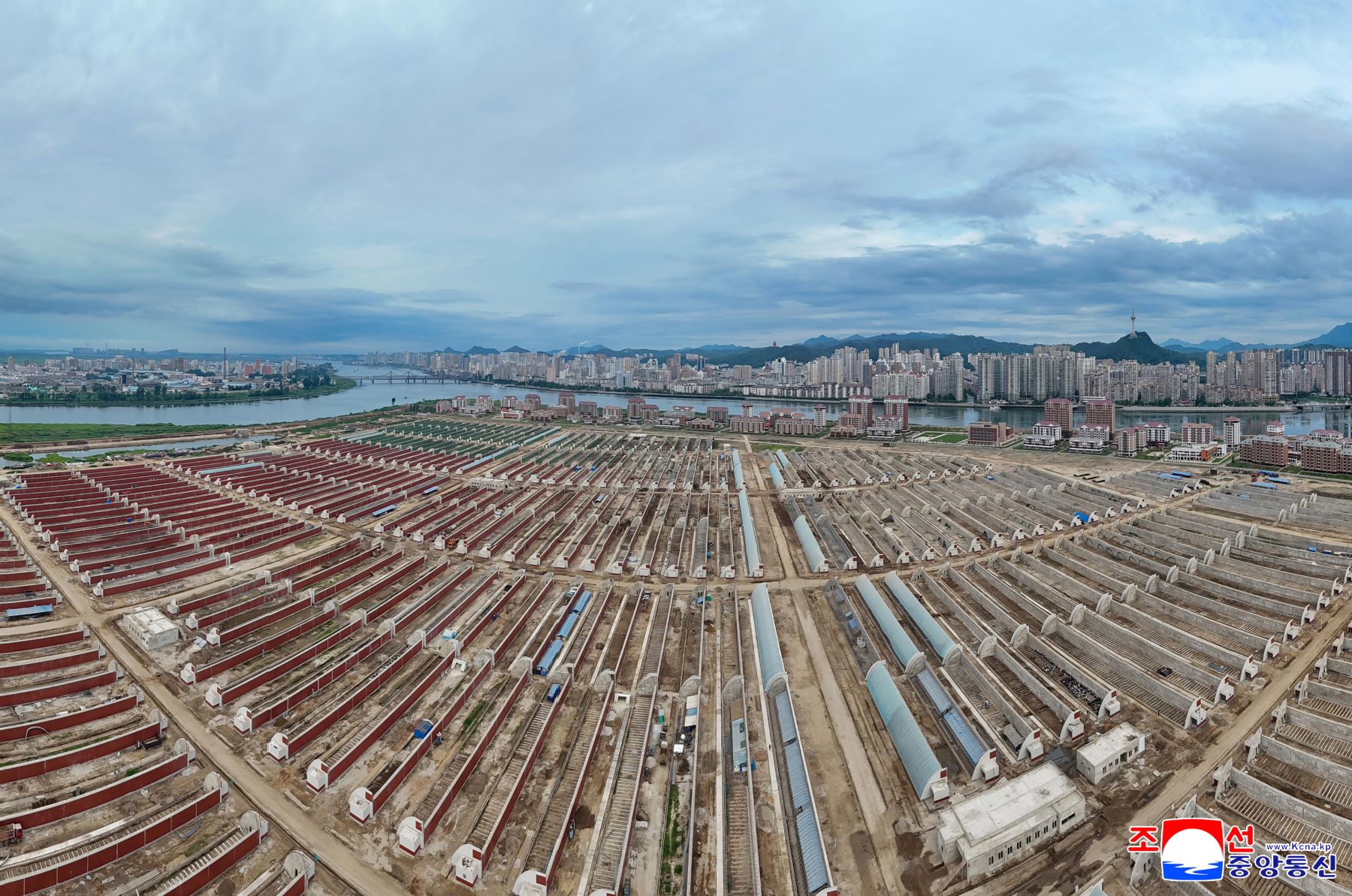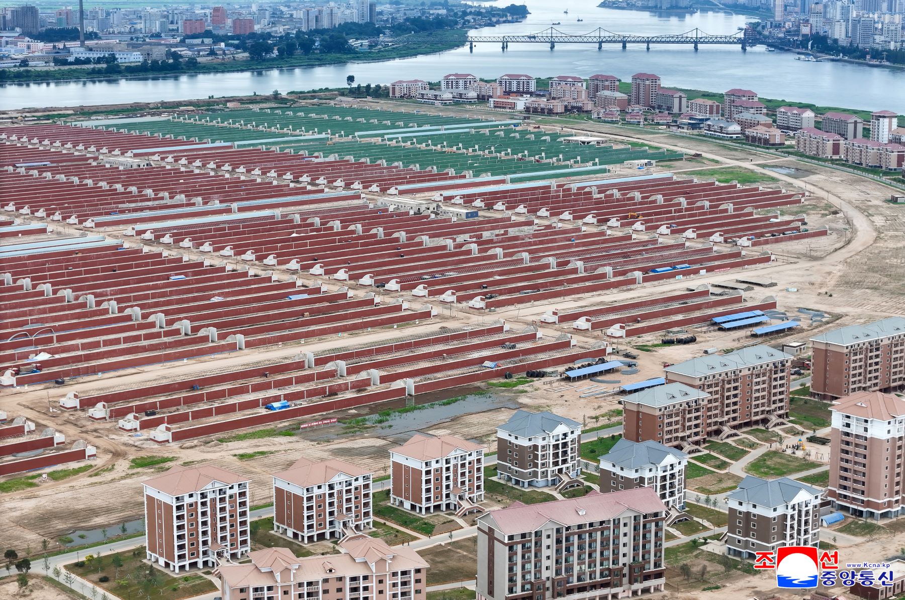 tenga como fondo las modernas viviendas alineadas a lo largo del río Amnok, esta zona